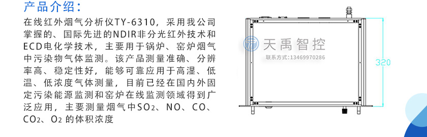 • 在線紅外氣體分析儀 TY-6300 在線紅外氣體分析儀TY-6300采用自主知識產權的NDIR非分光紅外技術,主要用于測量CO、CO2、CH4、C3H8、SO2、NO等氣體的體積濃度及熱值。適用于鋼鐵、化工、煤氣化、生物氣化、節能監測、能效測評等領域,測量焦爐煤氣、高爐煤氣、轉爐煤氣、混合煤氣、發生爐煤氣、生物燃氣等可燃氣體不同成分的體積濃度和熱值。