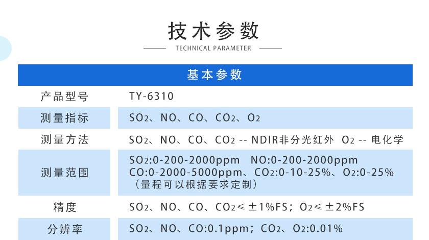 SO2、NO、CO、CO2:≤±1%FS;O2:≤±2%FS
