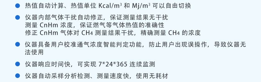 采用進口NDIR非分光紅外傳感器,長壽命電化學(xué)傳感器,運用先進的數(shù)字處理技術(shù),可同時測量沼氣中CH4、CO2、H2S、O2、CO、H2的體積濃度,根據(jù)氣體濃度值快速準確計算出相應(yīng)的熱值。