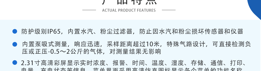 CO(0~1000ppm)、H2S(0~100ppm)、O2(0~30%Vol)、Ex(0~LEL)、CO2(0~5000ppm)、NOX(0~1000ppm),其他量程可訂制