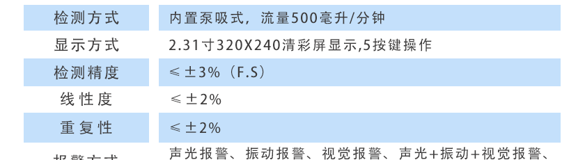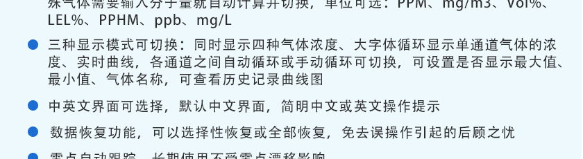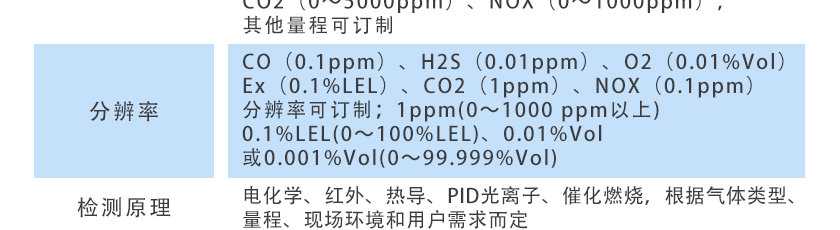 CO(0.1ppm)、H2S(0.01ppm)、O2(0.01%Vol)、Ex(0.1%LEL)、CO2(1ppm)、NOX(0.1ppm),分辨率可訂制1ppm(0~1000 ppm以上),0.1%LEL(0~100%LEL)、0.01%Vol或0.001%Vol(0~99.999%Vol)