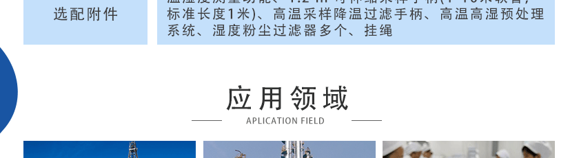 溫濕度測量功能、1.2 m 可伸縮采樣手柄(1-10米軟管,標準長度1米)、高溫采樣降溫過濾手柄、高溫高濕預處理系統、濕度粉塵過濾器多個、掛繩