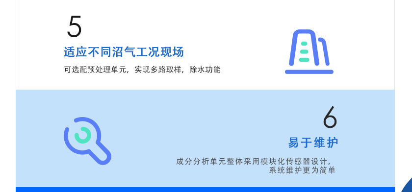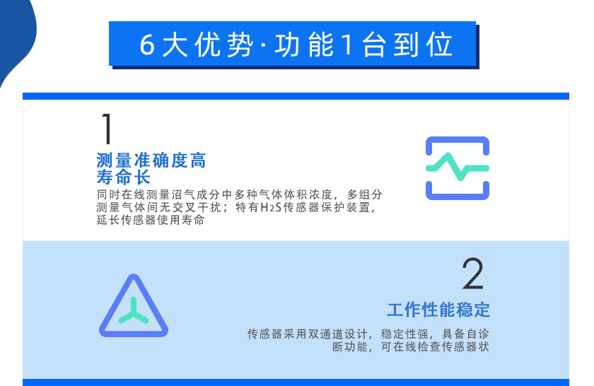 同時在線測量沼氣成分中多種氣體體積濃度,多組分測量氣體間無交叉干擾;特有H2S傳感器保護裝置,延長傳感器使用壽命