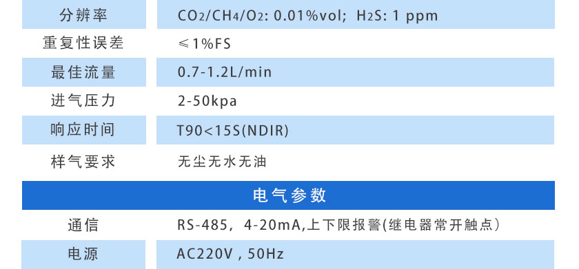 CO2/CH4:±2%FS;  H2S/O2:±3%FS