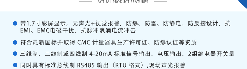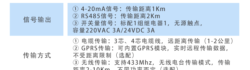 ①4-20mA信號:傳輸距離1Km ②RS485信號:傳輸距離2Km ③開關(guān)量信號:標配1組繼電器1,無源觸點,容量220VAC 3A/24VDC 3A |