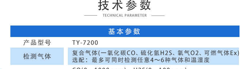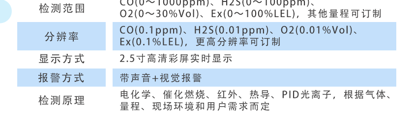 CO(0~1000ppm)、H2S(0~100ppm)、O2(0~30%Vol)、Ex(0~100%LEL),其他量程可訂制