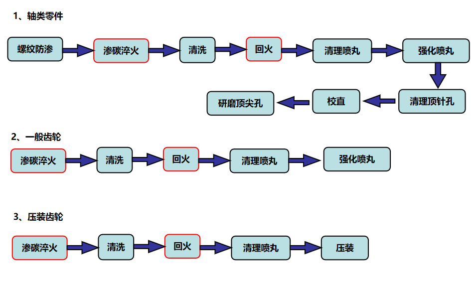 在生產中,一般常把熱處理分為預備熱處理和最終熱處理兩類。一般比較重要的零件制造過程大致是: