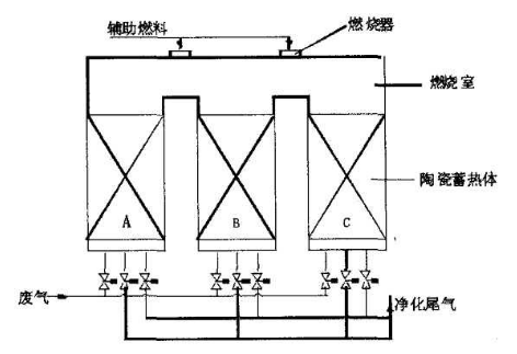 RTO裝置主要是由多臺(tái)蓄熱室和頂部相連通燃燒室組成,其中蓄熱室內(nèi)部通常采用具有良好耐高溫性能的陶瓷材料作為蓄熱體。燃燒室舍友輔助燃燒器,可用油或天然氣作為燃料。輔助燃燒器的作用主要是為了在開(kāi)車時(shí)將蓄熱體加熱到一定溫度,或當(dāng)廢氣中可燃物的濃度較低時(shí),需要補(bǔ)充燃料來(lái)維持燃燒室所要求達(dá)到的反應(yīng)溫度。