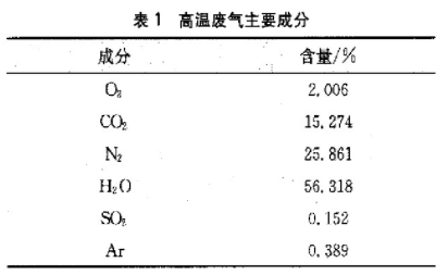 以萬州凈化廠為例:設計天然氣處理能力為200萬Nm/d,原料天然氣H2S含量30~60g/Nm,COz含量50~100g/m。脫硫裝置通過甲基二乙醇胺(MDEA)溶液對原料天然氣中的酸性組分進行脫除,并利用溶液再生時產生的酸氣通過硫磺回收裝置將酸氣組分中的HS轉化生成硫磺,設計硫磺回收率達99.25%。未完全轉化的HS通過尾氣灼燒爐燃燒為SO2并排人大氣。雖然有較高的回收率,但因酸氣量大,未完全回收的HS燃燒產生的SO量也非常大。萬州凈化廠尾氣灼燒爐灼燒后的高溫廢氣主要成分見表1.