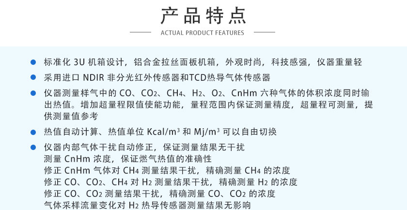 采用自主知識產(chǎn)權的NDIR非分光紅外技術,主要用于測量氣體中的CO、CO2、CH4、C3H8、SO2、NO等氣體的體積濃度及熱值。全進口傳感器、測量精度高、結構簡單、維護方便,軟件功能強大,可拓展性強、現(xiàn)場實用性好,目前暢銷國內(nèi)外。