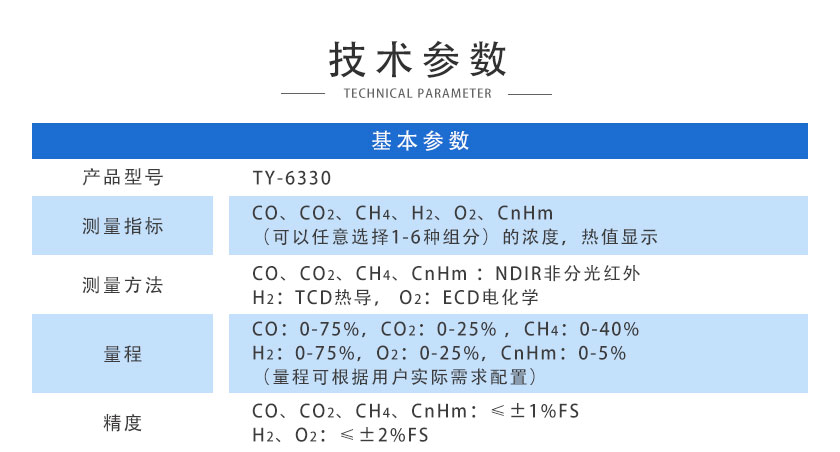 CO、CO2、CH4、CnHm :NDIR非分光紅外 H2:TCD熱導, O2:ECD電化學 |