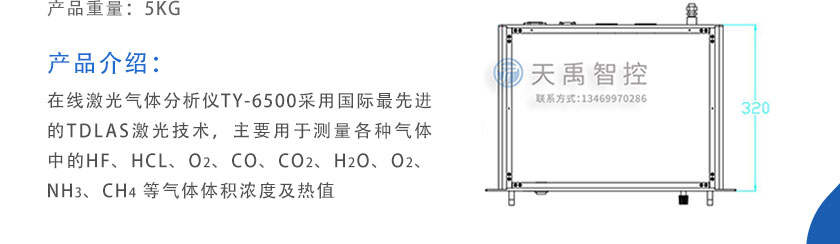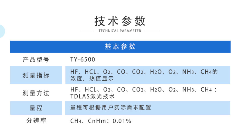• 在線激光氣體分析儀 TY-6500 在線激光氣體分析儀TY-6500采用國際最先進的TDLAS激光技術,主要用于測量各種氣體中的HF、HCL、O2、CO、CO2、H2O、O2、NH3、CH4?等氣體體積濃度及熱值。